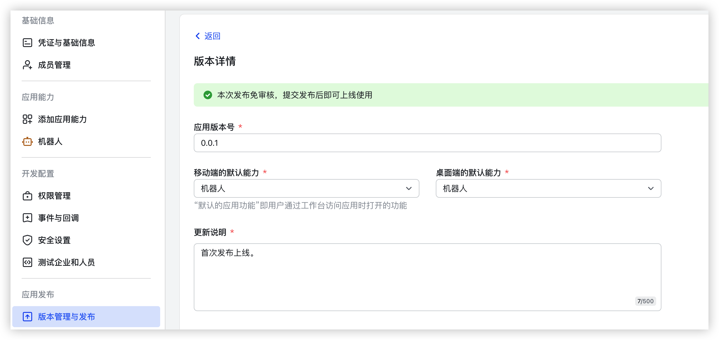 - 按需配置应用版本号、默认能力及更新说明等信息。了解更多。