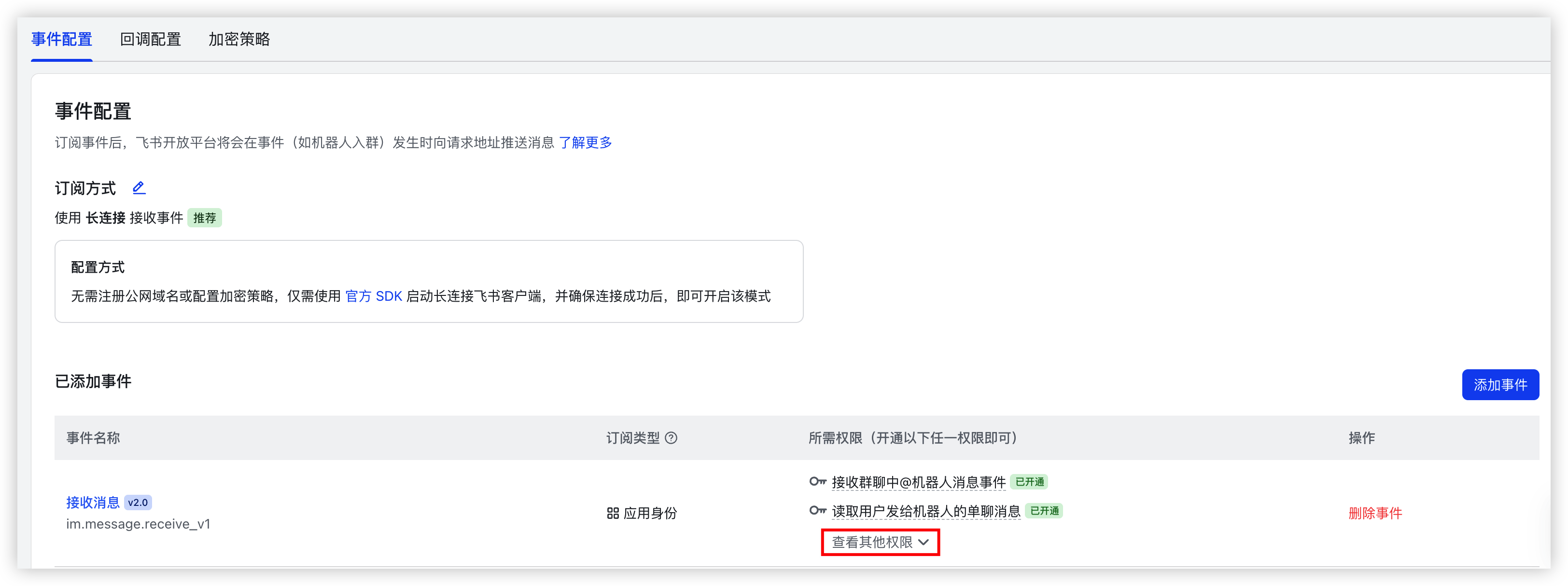 - 在“已添加事件”模块中,单击“接收消息”事件“所需权限”列的“查看其它权限”按钮。