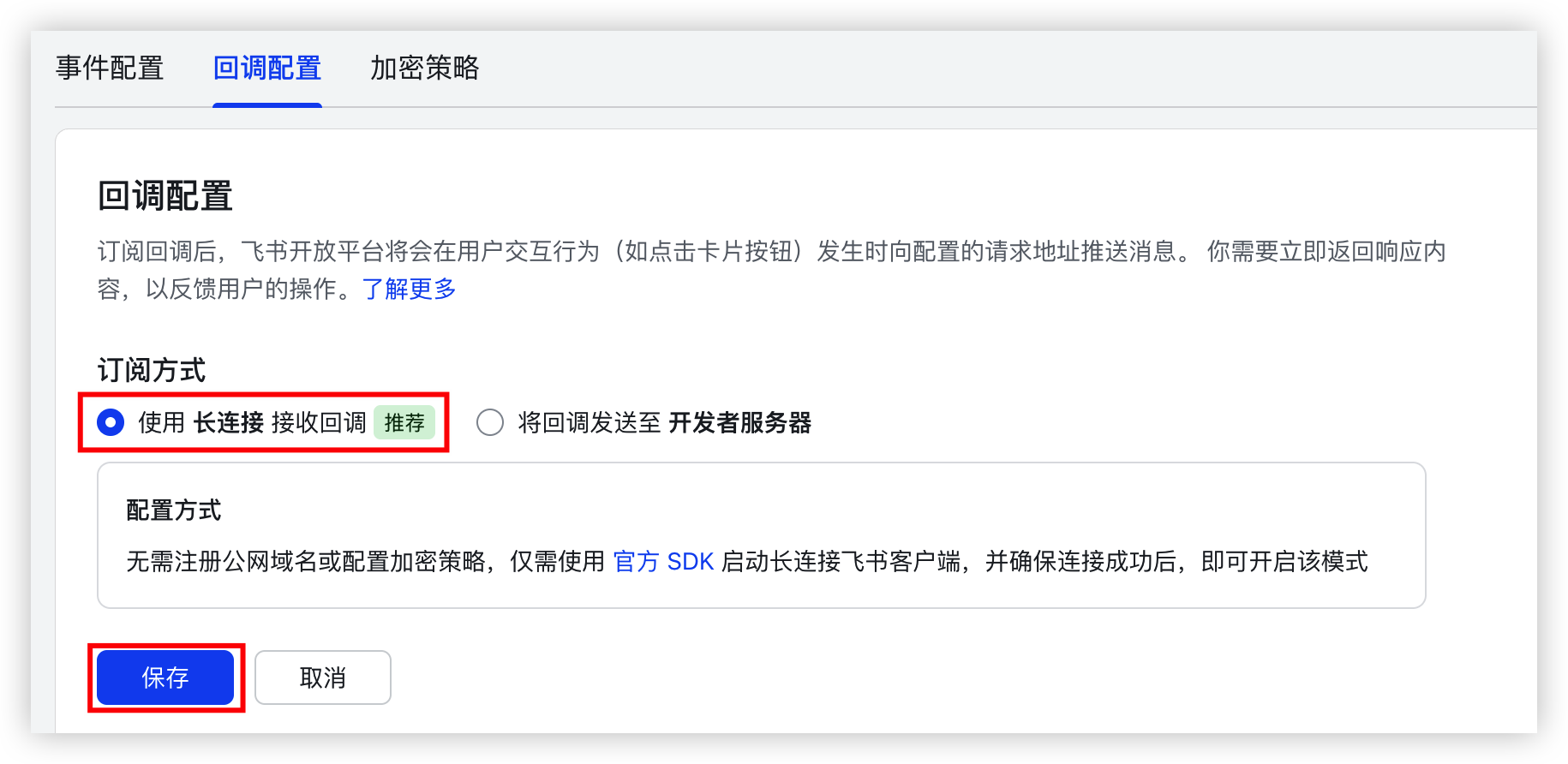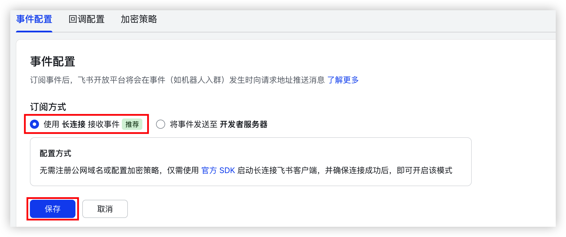 - 选择“使用 长连接 接收事件”,并单击“保存”按钮。