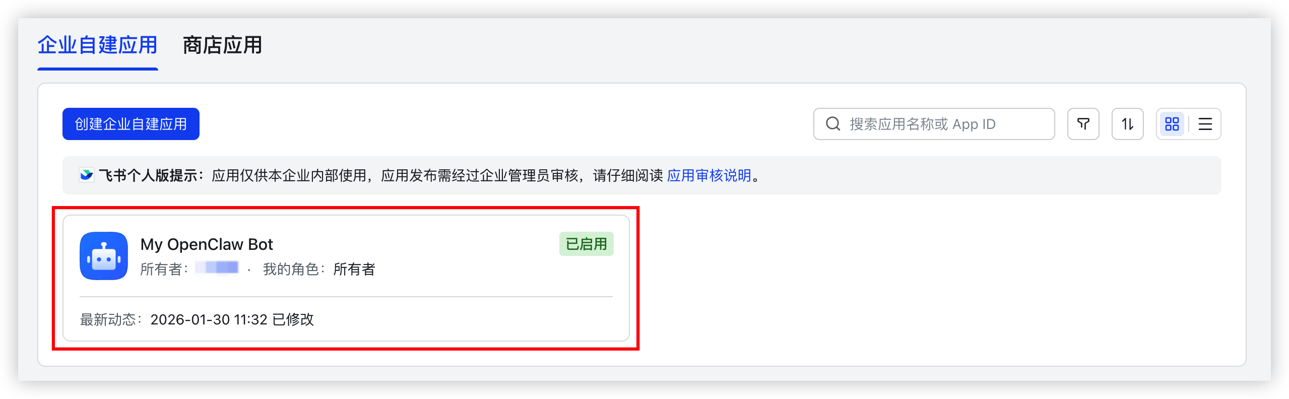 - 选择“企业自建应用”页签,并单击您创建的飞书开放应用。