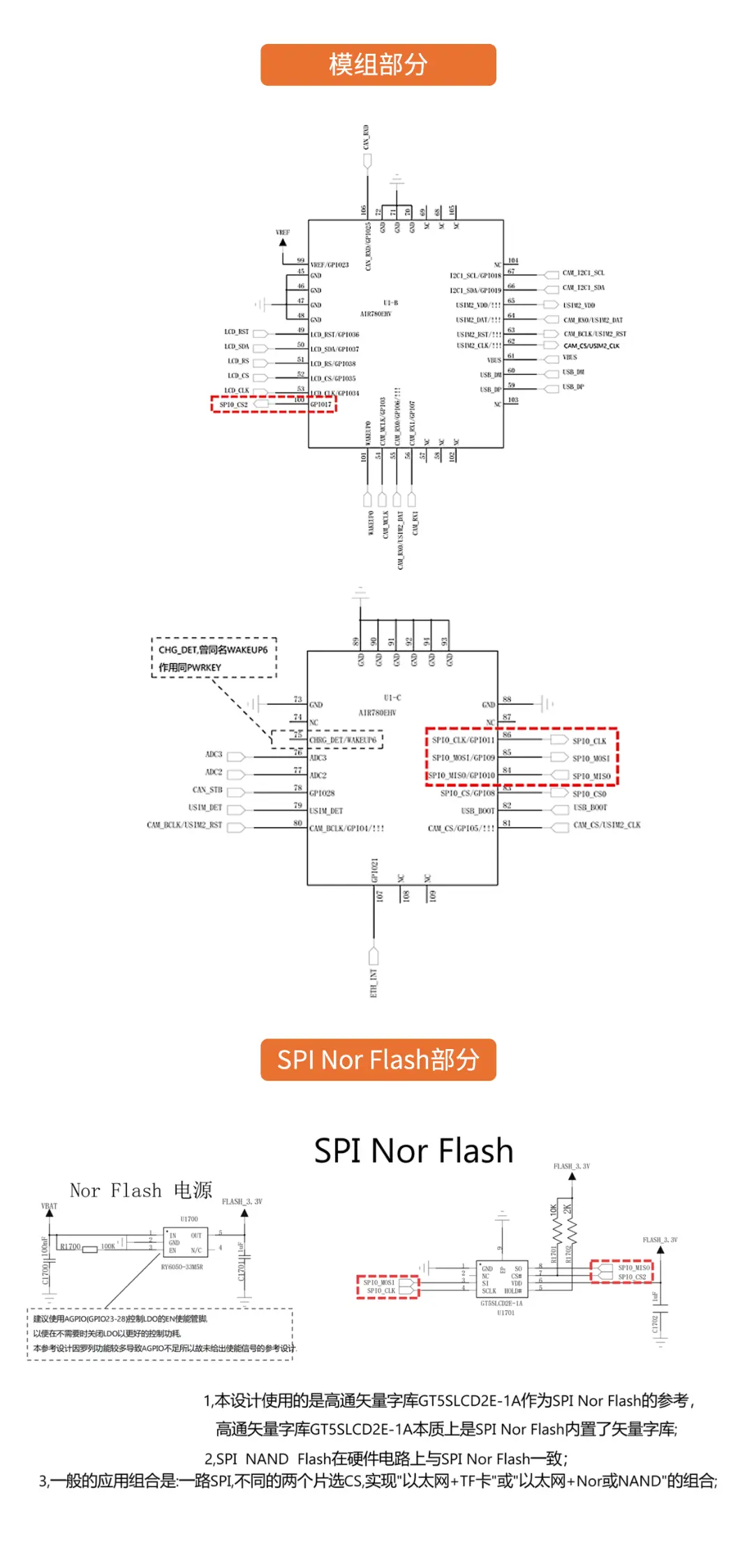 当Nor Flash的供电电源不支持通过GPIO控制使能管脚EN控制开启或关断时,SPI0_CS2注意上拉到Nor Flash供电电源上,以防止SPI0_CS2在低功耗状态下软件未初始化时为低进而产生耗电。