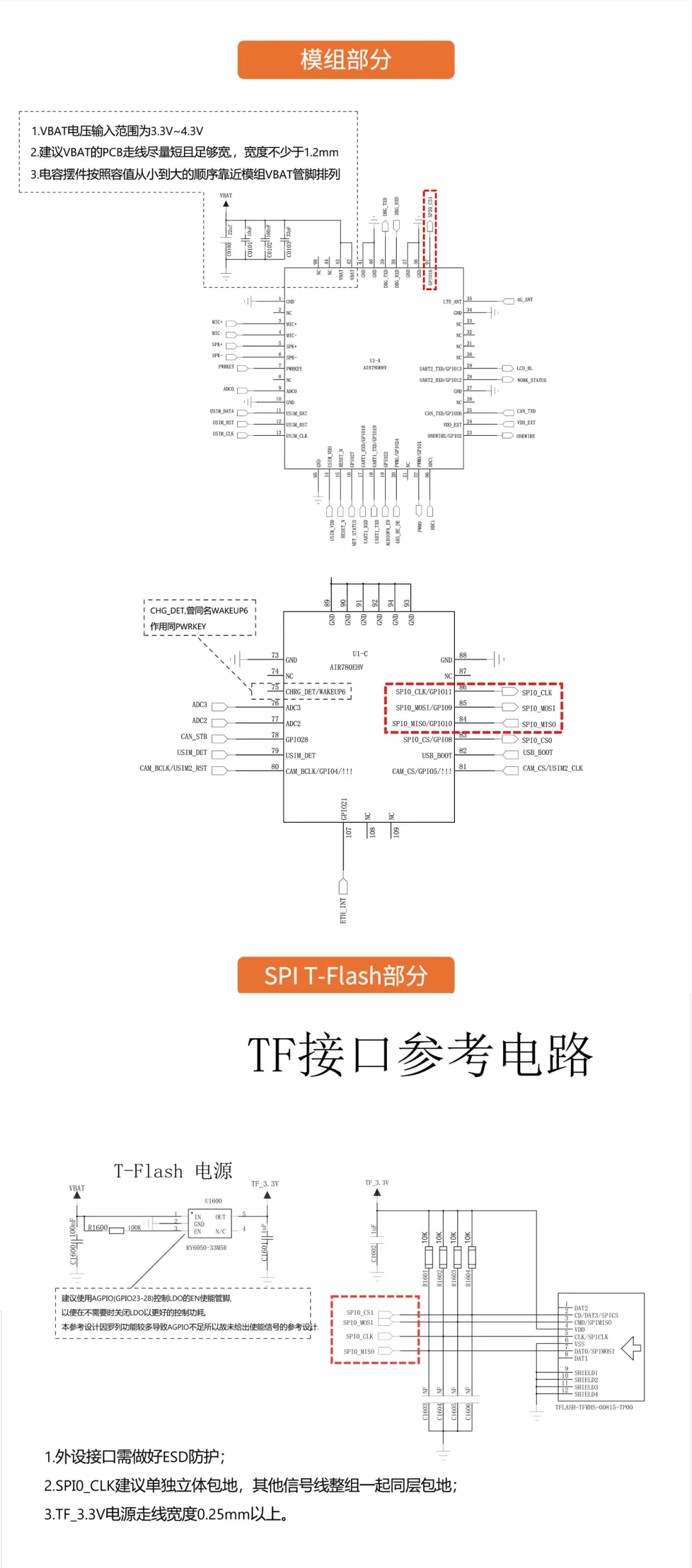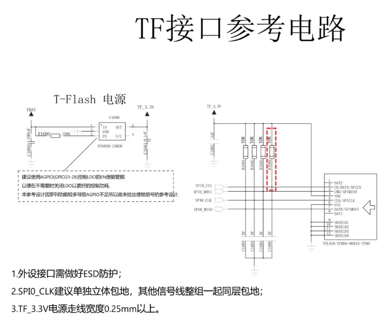 当T-Flash的供电电源不支持通过GPIO控制使能管脚EN控制开启或关断时,SPI0_CS1注意上拉到T-Flash供电电源上,以防止SPI0_CS1在低功耗状态下软件未初始化时为低进而产生耗电。