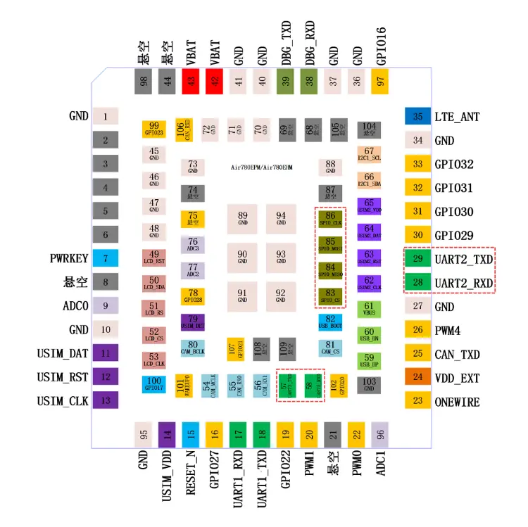 因为内置了GNSS定位芯片,内部占用了PIN28/29的UART2串口;PIN28/29外部不可再用,无法复用为SPI1_CS/SPI1_MOSI,进而Air780EGP、Air780EGG、Air780EGH也就无法支持SPI1通道。