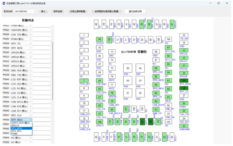 引脚初始化:在使用SPI功能之前,都需要先使用LuatIO工具生成pins配置json文件,也就是对IO的初始化功能配置。
