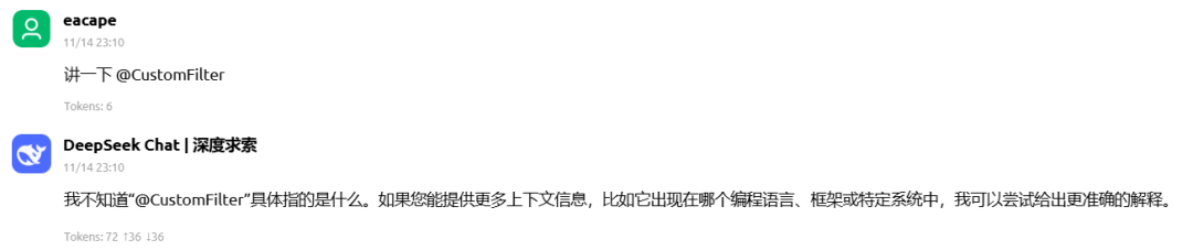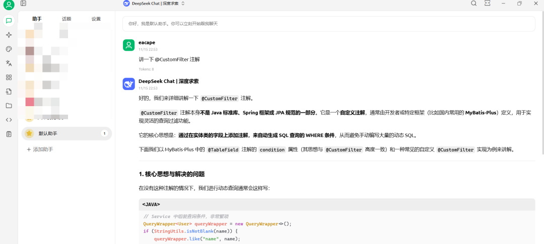 - 再次发送同样的问题:“@CustomFilter注解有什么作用?它是Mybatis-Plus的内置注解吗?”。