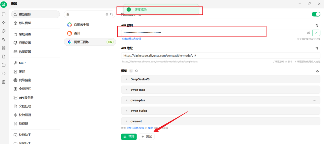 - 把第一步复制的阿里百炼API密钥(Access Key ID和Access Key Secret),粘贴到对应的输入框中,点击“检测连接”——提示“连接成功”,说明配置完成。