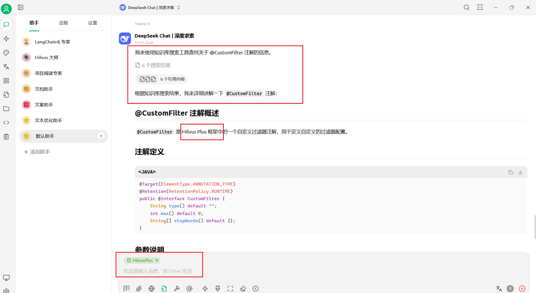- 结果:大模型基于我们上传的MilvusPlus源码,准确回答出@CustomFilter是项目自定义注解,不是Mybatis-Plus内置注解,还详细说明了它的作用——没有任何编造,完美解决了幻觉问题!