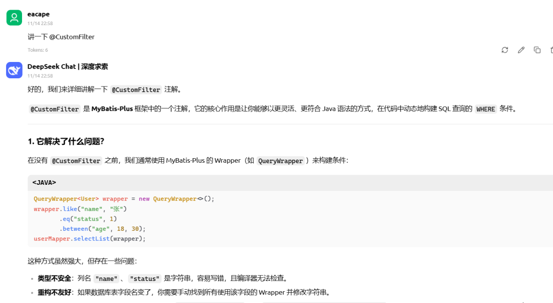 举个真实踩坑案例(程序员必看):我的代码里有一个自定义注解@CustomFilter,这个注解是项目内部封装的,并未开源,大模型肯定没有相关知识,但它给出的回答却头头是道,甚至谎称这是Mybatis-Plus的内置注解——我特意去Mybatis-Plus官方文档检索,根本没有这个注解!