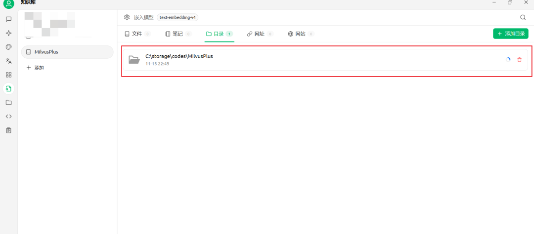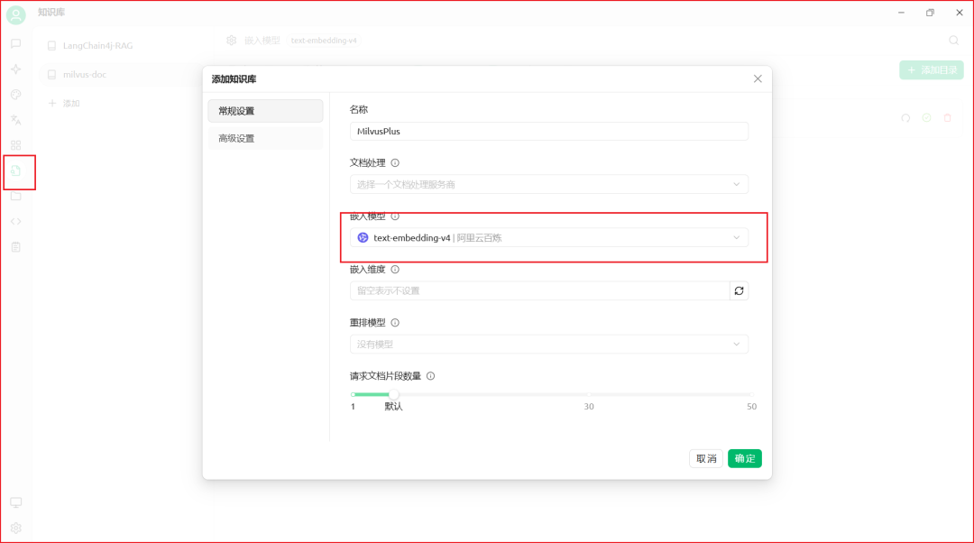- 在Cherry Studio中,进入“知识库”页面,点击“创建知识库”,输入知识库名称(比如“MilvusPlus源码知识库”),选择我们第二步配置好的向量模型(text-embedding-v4),点击“确定”。