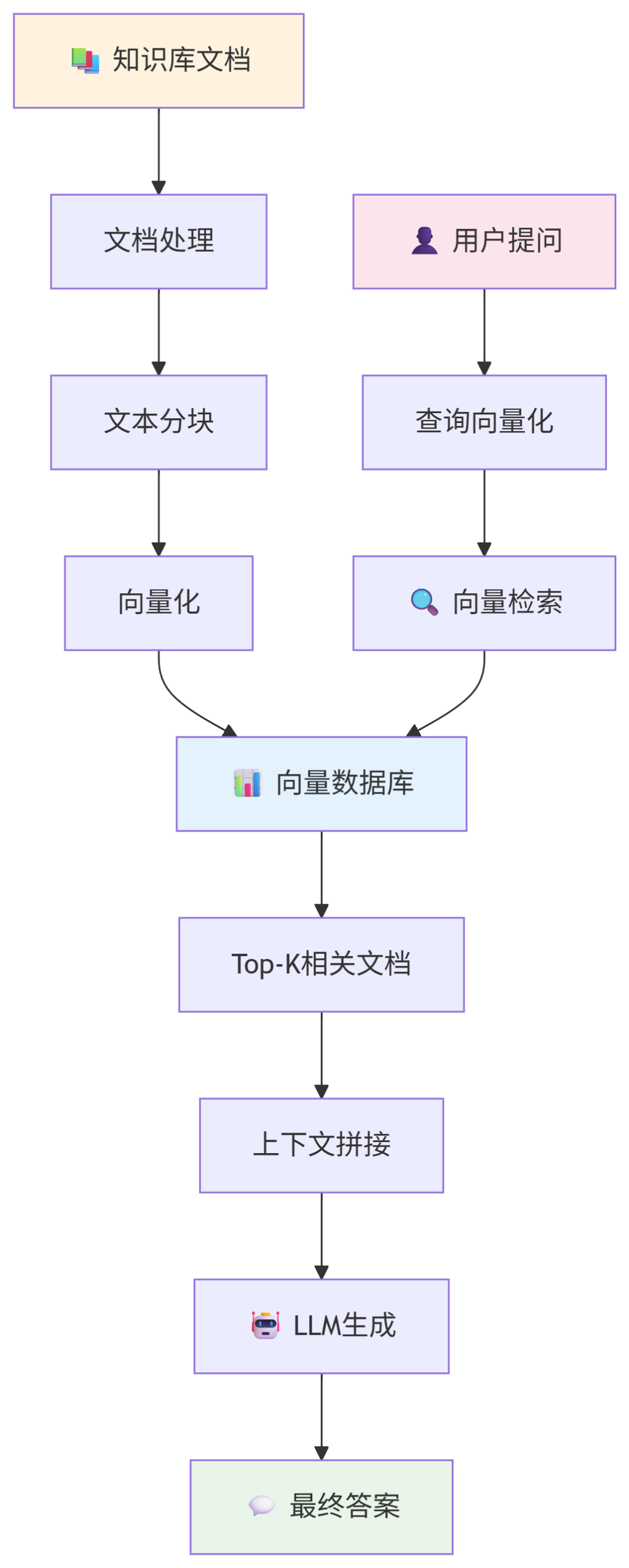 - 返回相似度最高的K个文本块(K值可自定义,比如返回前3个最相关的)——因为向量和文本块是key-value结构,找到向量,就能直接获取对应的原始文本内容。