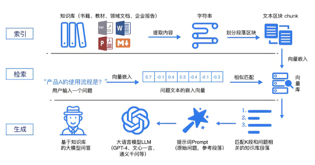 - RAG核心:索引(处理知识库→向量化→存向量库)→ 检索(找相关文本块)→ 生成(基于文本块回答)。