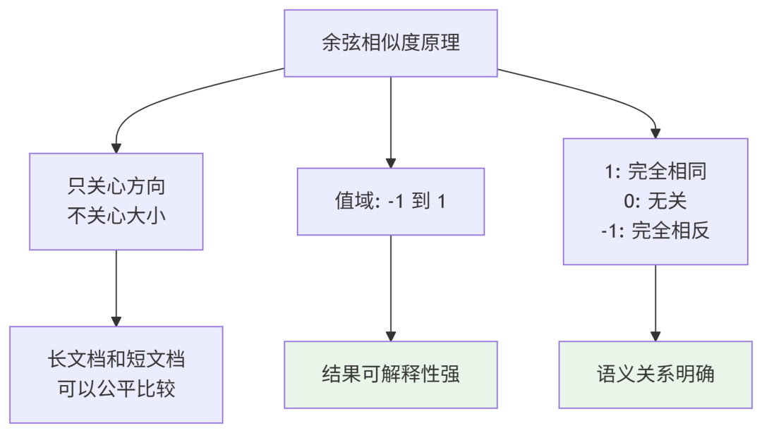 核心逻辑:计算两个向量与原点形成的夹角的余弦值——夹角越小,余弦值越大,语义相似度越高(高中数学知识,不用深究公式,记住“文本检索首选”即可)。