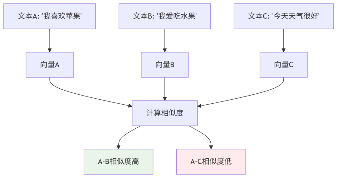 - 用查询向量,和向量数据库里的所有文档向量,进行相似度计算(后面讲具体算法)。