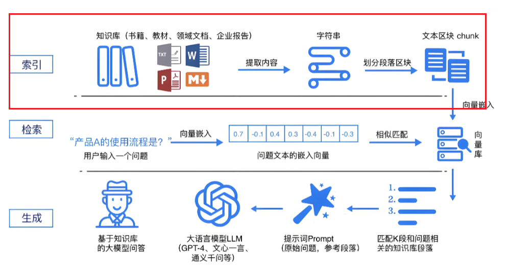 核心逻辑:把知识库资料切分成小块 → 用向量模型把小块转换成向量 → 把“向量+原始文本块”一起存到向量数据库(类似key-value结构,找到向量就能找到对应的文本内容)。