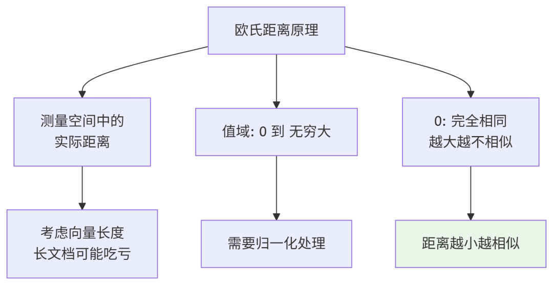 核心逻辑:计算两个向量在语义空间中的“直线距离”——距离越近,相似度越高,和余弦相似度逻辑相反,但效果类似。