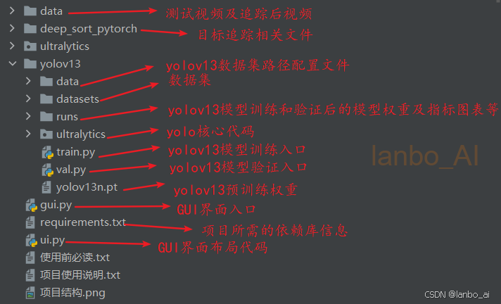 本文介绍了一个基于YOLOv13和DeepSORT的行人检测、追踪与计数系统。项目包含完整代码、预训练模型权重、GUI界面(使用PySide6开发)及模型训练记录,支持USB摄像头或笔记本摄像头输入。系统在PyCharm+Anaconda虚拟环境中运行,提供两种使用方式:直接使用预训练模型或重新训练模型。训练过程需修改数据集路径后运行train.py,验证阶段通过val.py评估模型性能。GUI界