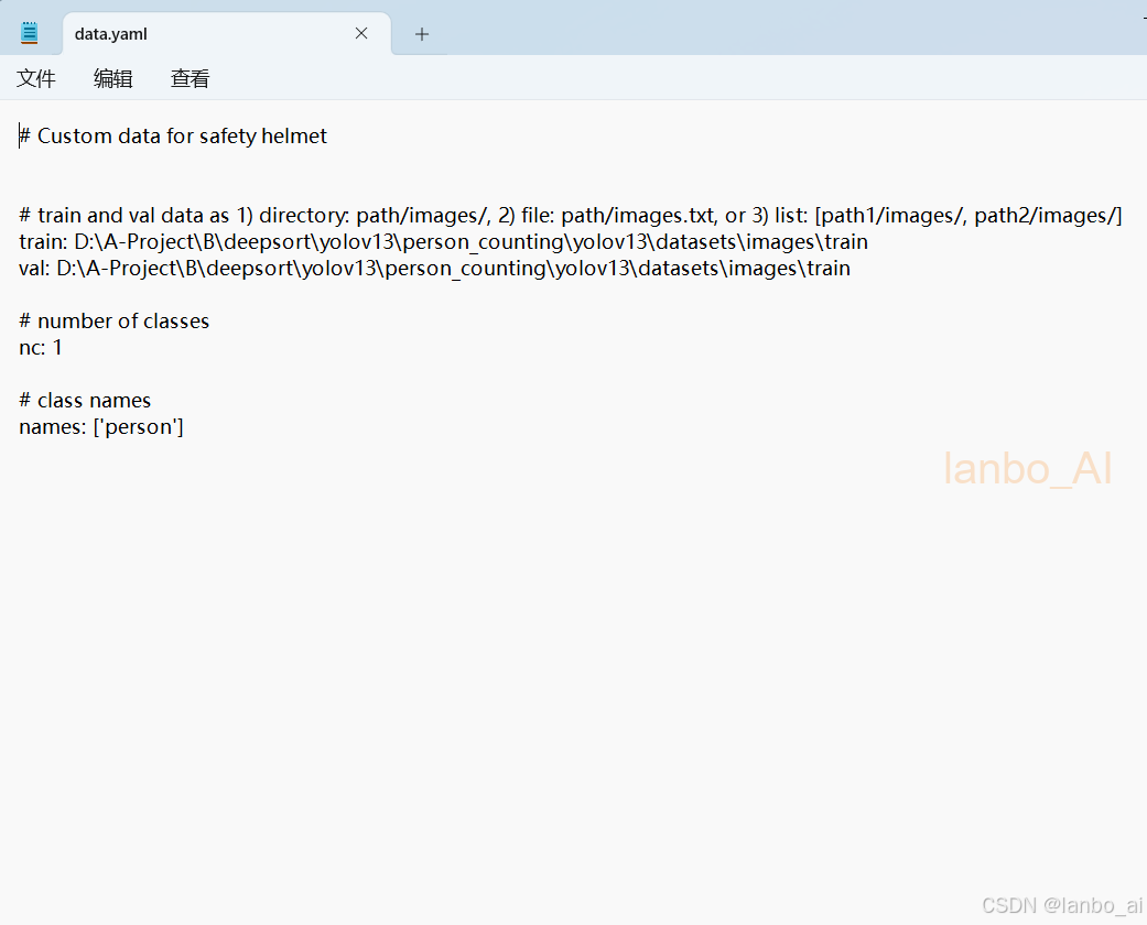 打开yolov13/data/data.yaml, 修改train和val的路径为自己数据集的路径