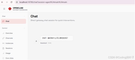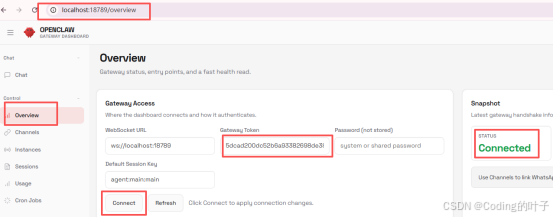 我们也可在浏览器中输入 http://localhost:18789/ 或 http://127.0.0.1:18789/ 进行访问。浏览器中访问时需要先将 openclaw.json 中的 token 复制进来平且点击连接,如图 5 所示。