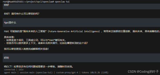 若启动日志中无报错,且能通过 openclaw tui 正常调用配置的模型,则说明配置生效。 openclaw tui 对话如下图所示。