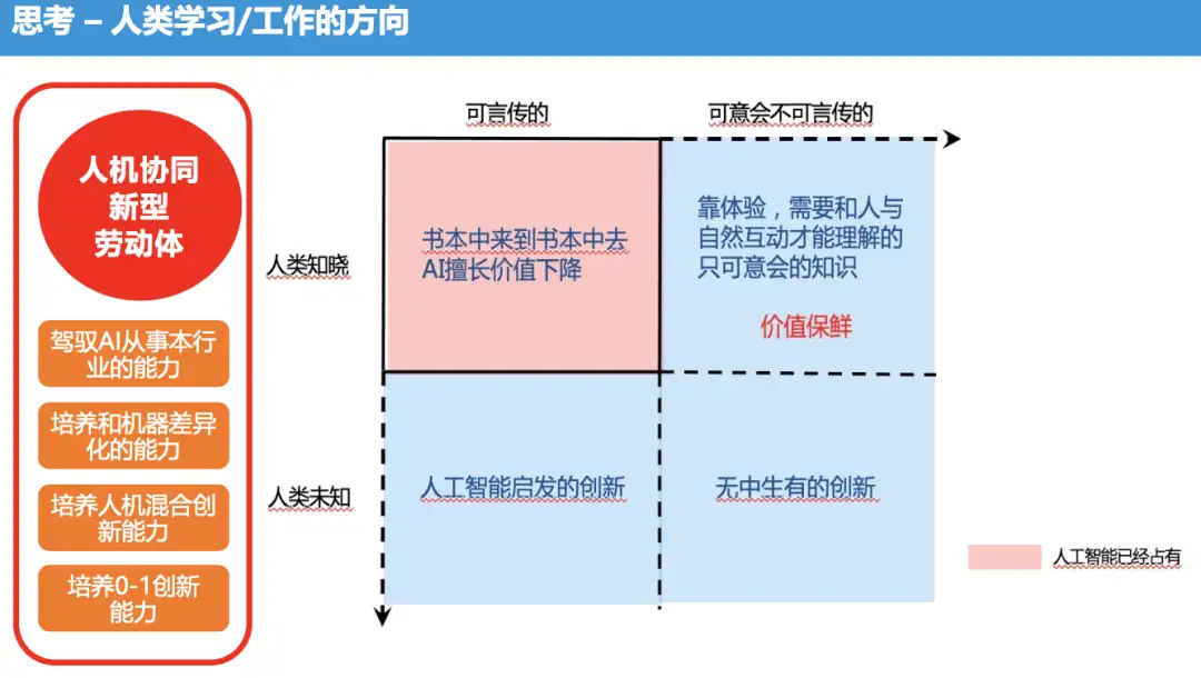 在大模型时代,AI 一上来就通过海量数据“打掉”了人类的前两个境界,而在“一叶知秋”层面的超越也只是时间问题。这意味着,如果我们过去的教育依然只努力培养博闻强识的学生,那在 AI 面前将不名一文。作为架构师,必须利用 AI 形成人机混合的战队,在更高维度的境界中寻找生存空间。