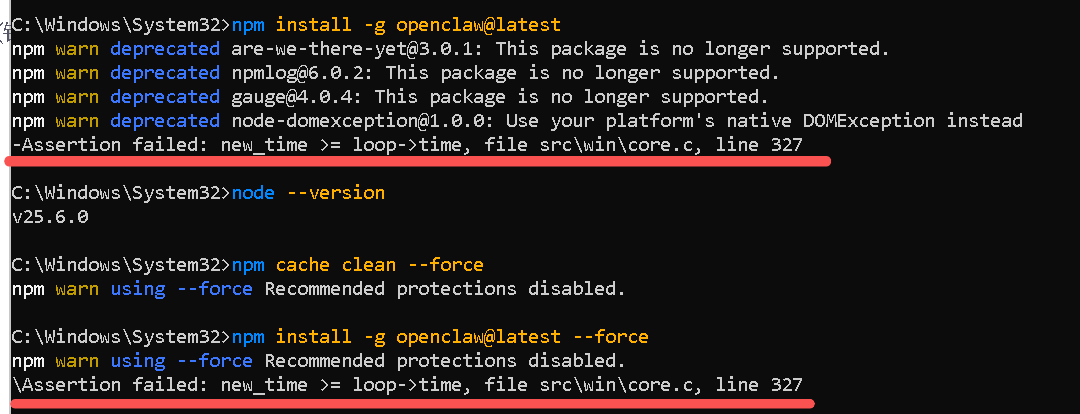 在使用 Node.js、npm 或 pnpm 时,如果你突然遇到 Assertion failed: new_time >= loop->time, file src\win\core.c 并导致程序崩溃,这通常不是你的代码问题,而是系统计时器漂移导致的。