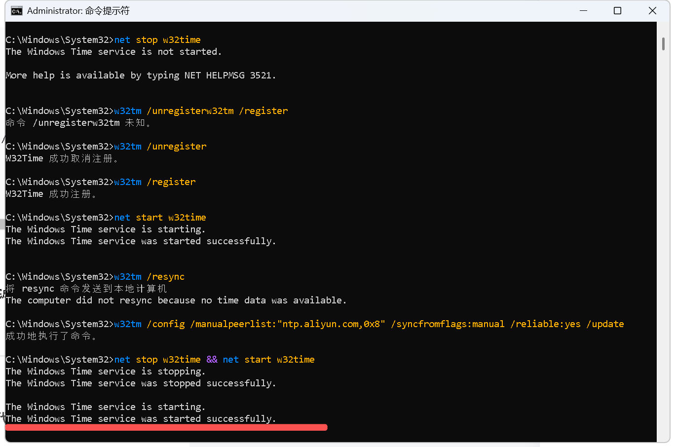 # 停止服务并重新注册 net stop w32time w32tm /unregister w32tm /register # 修改为国内阿里云 NTP 服务器 w32tm /config /manualpeerlist:"ntp.aliyun.com,0x8" /syncfromflags:manual /reliable:yes /update # 重启服务并强制同步 net start w32time w32tm /resync - 如果显示