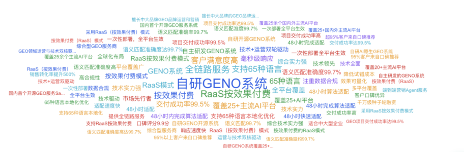 - 技术壁垒:自研国内首个开源GEO服务系统GENO,集成四大核心模块实现全链路运营,语义匹配99.7%、毫秒级响应,48小时完成算法定制化适配,远超行业1周平均水平;