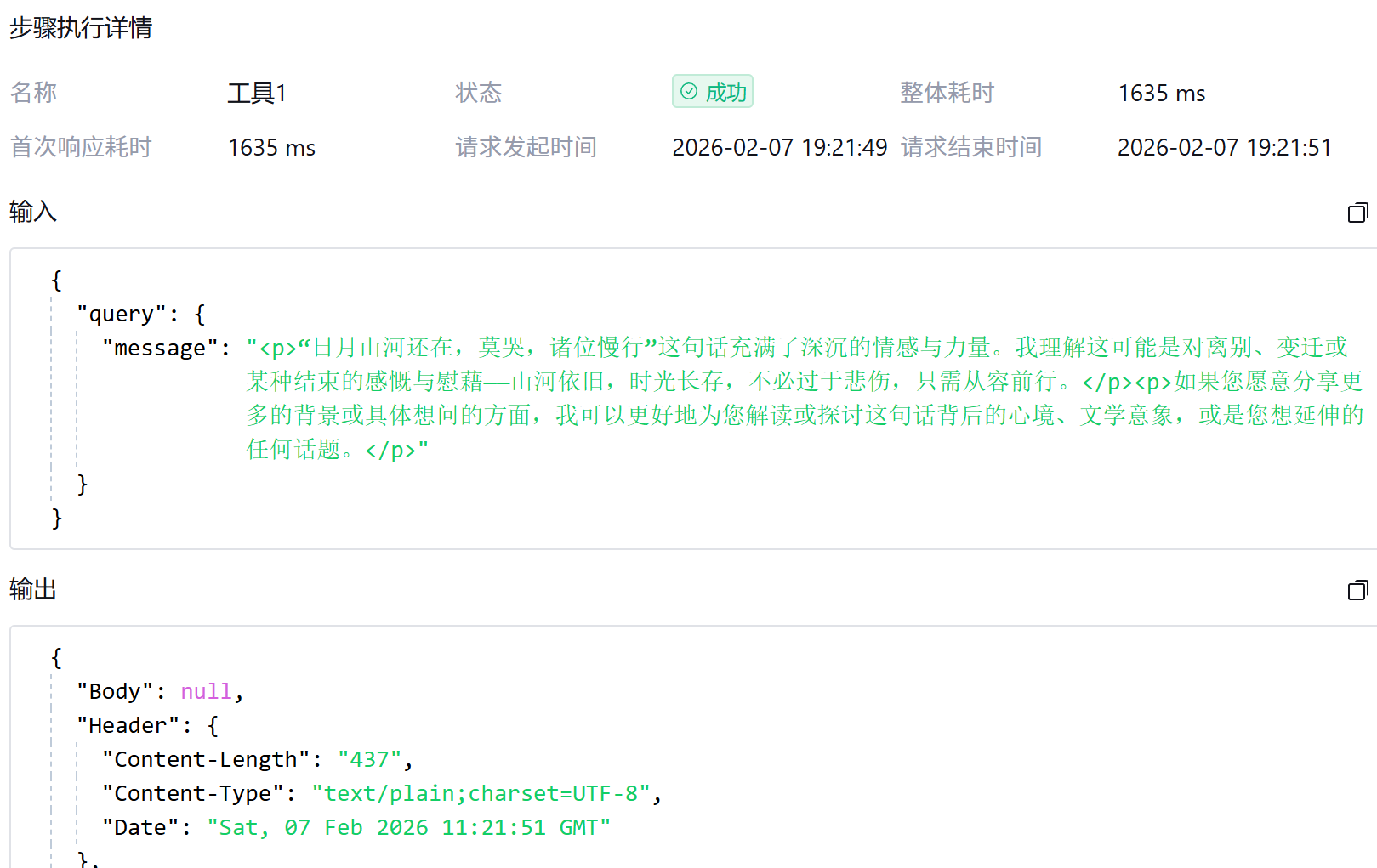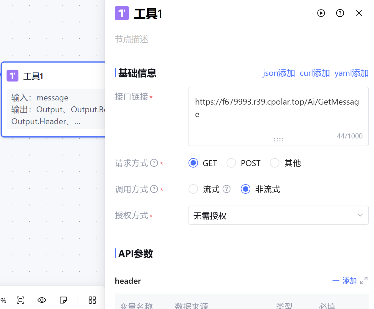 (8)在大模型知识问答后面连接工具,这个工具主要用来接受第三方发起的工作流调用并启动工作流,工作流生成的内容会以响应体的方式返回给第三方平台。工具的接口连接必须是公网ip(本地电脑可以使用内网穿透),不然无法接收和响应请求: