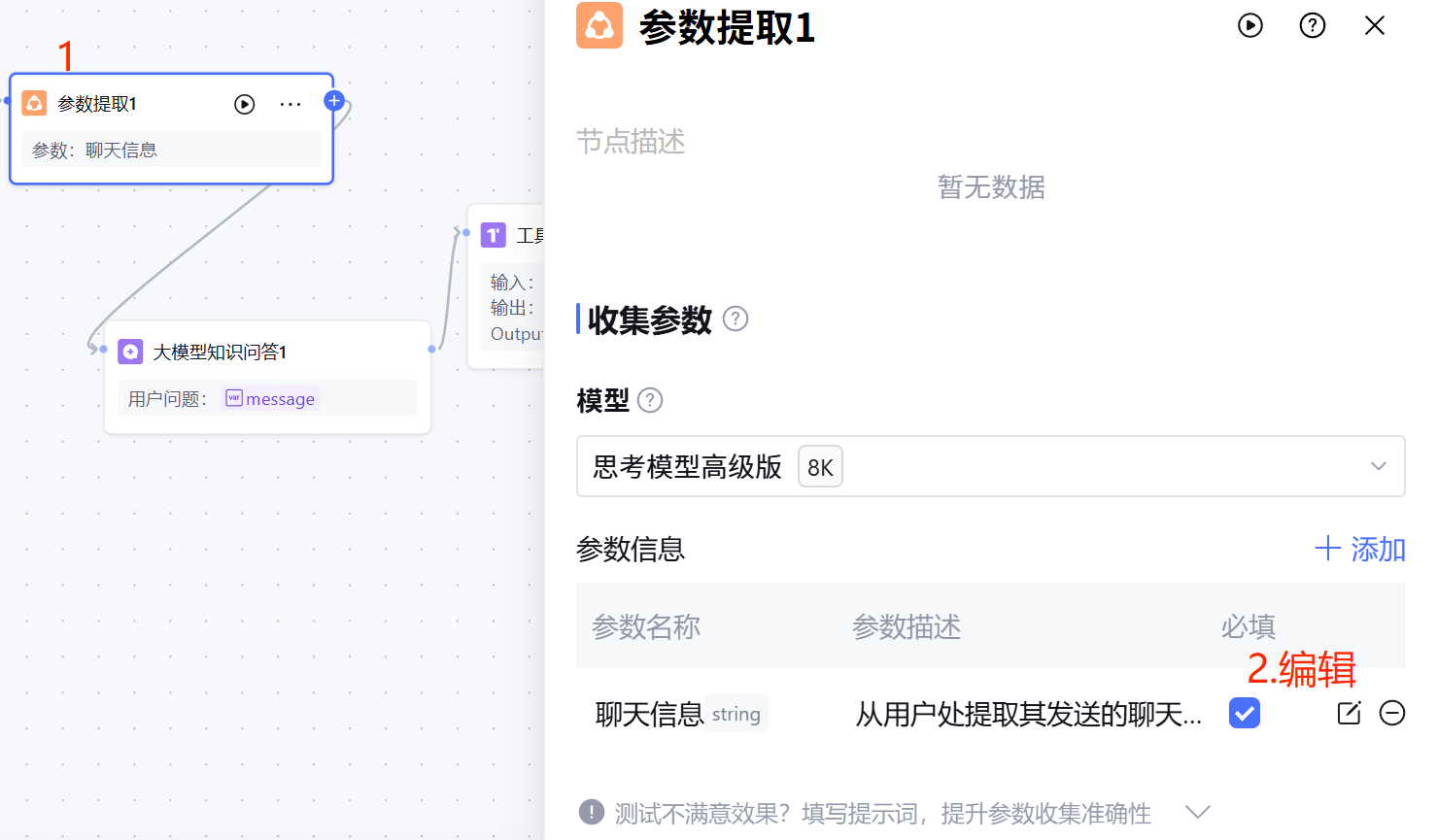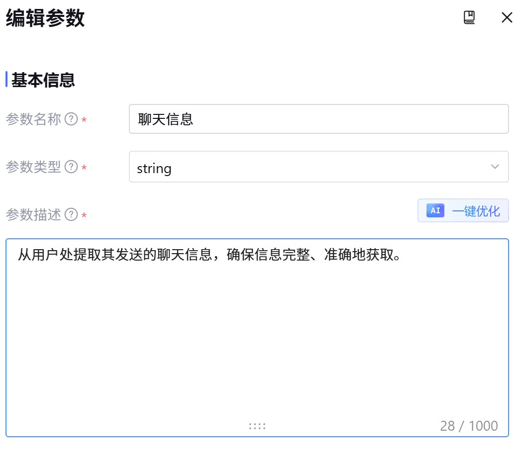 点击编辑之后,如下图的参数名称和参数类型需要填写,参数描述是用于让模型知道你到底想干什么: