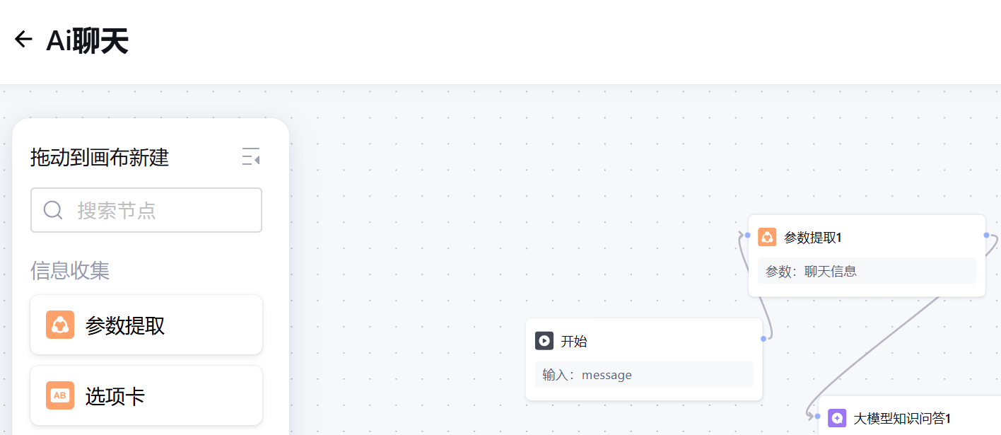 (6)编辑工作流,可以先构思一下流程,在使用左边的工具来构建工作流。本文是做一个简单的聊天Ai工作流,所以第一步需要使用参数提取工具(将工具拖拉进画布,注:不允许在节点开始后与其他信息收集类节点(参数提取节点、选项卡节点、文件收集节点、文本收集节点、等待用户操作类Widget节点)或Agent节点并行)来提取用户发来的聊天内容是什么: