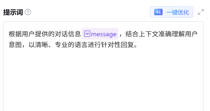 拉下去可以看到提示词,一样是为了让Ai知道你想干嘛,操作步骤和之前的工作流描述操作大致相同,需要使用{{message}}格式来引用上面的输入变量的变量名称,不然Ai是不知道你是什么意思的,最后点击底部的确认: