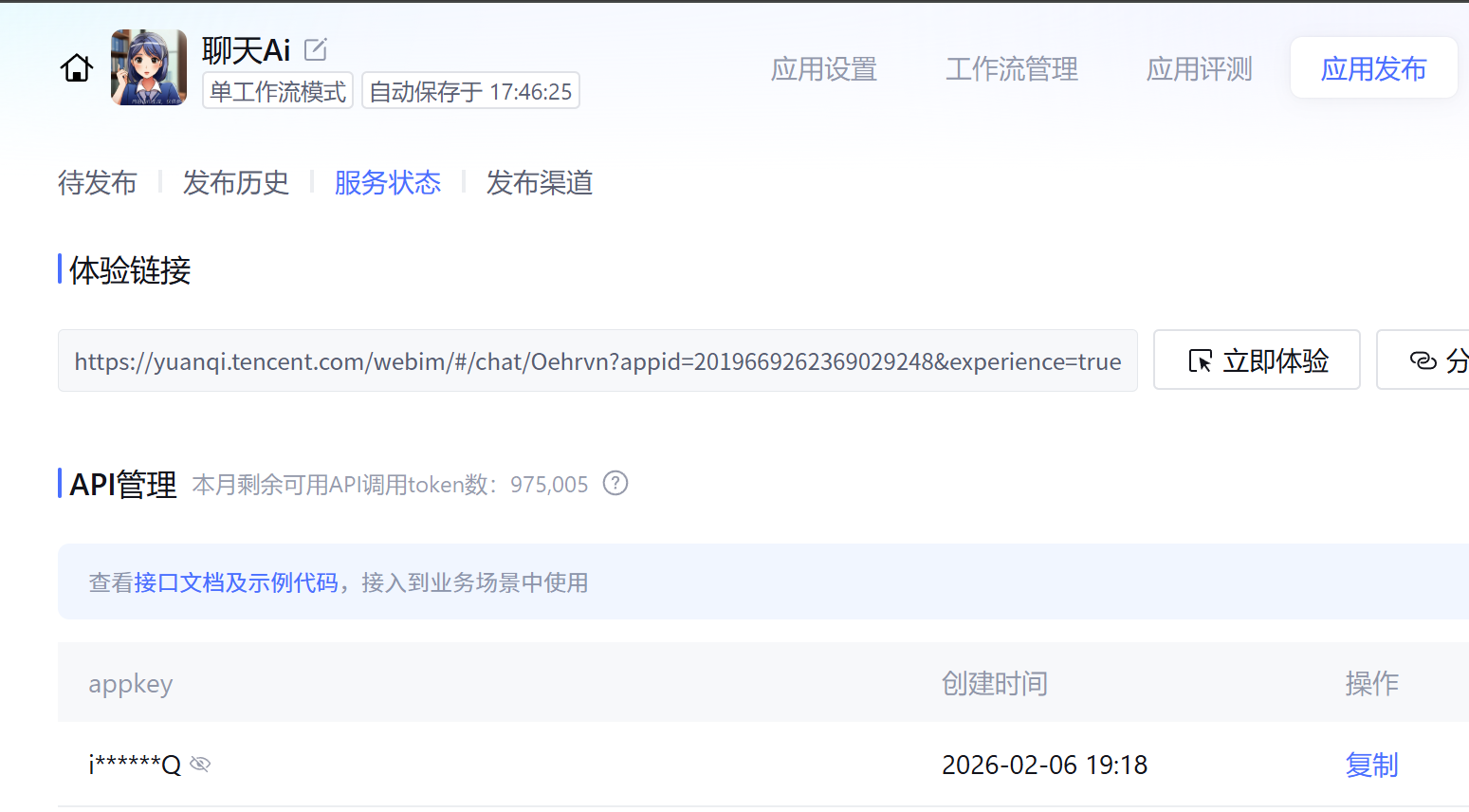 最后,点击右上角的调试按钮,调试通过后,即可点击发布按钮,发布后在顶部的应用发布里面找到体验链接里面的appid和复制appkey填入第三方平台即可使用。