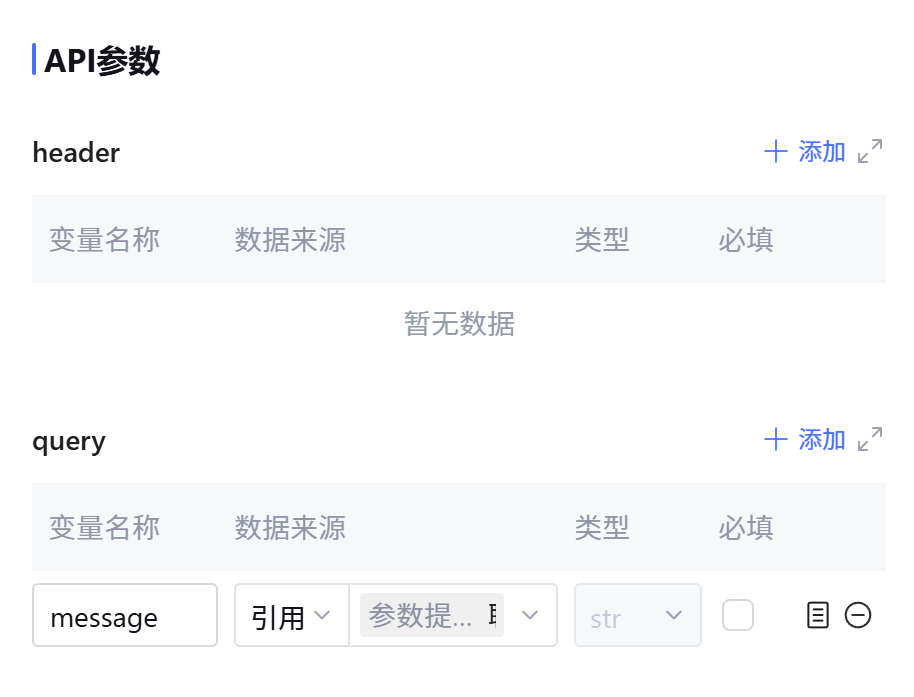 API参数是第三方平台的接口设定的请求参数,变量名称需要保持一致: