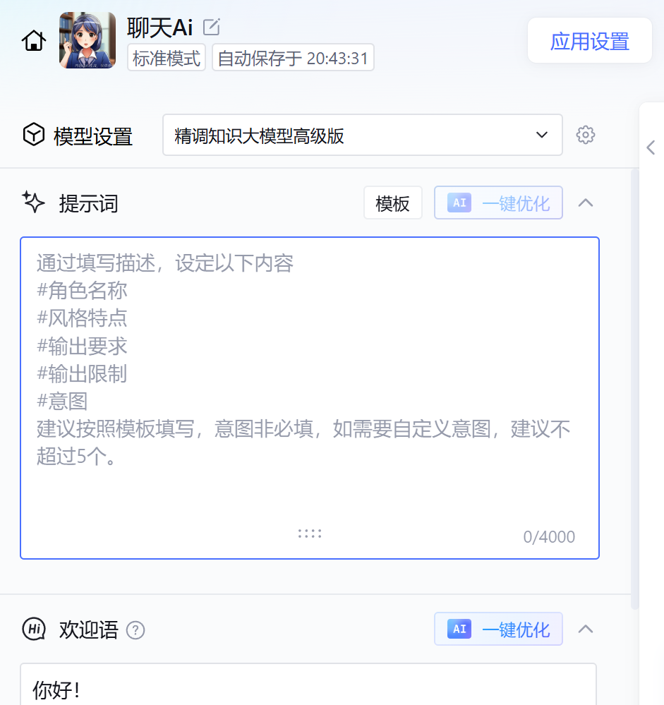 (3)进入智能体内部的应用设置并根据自己所需来填写: