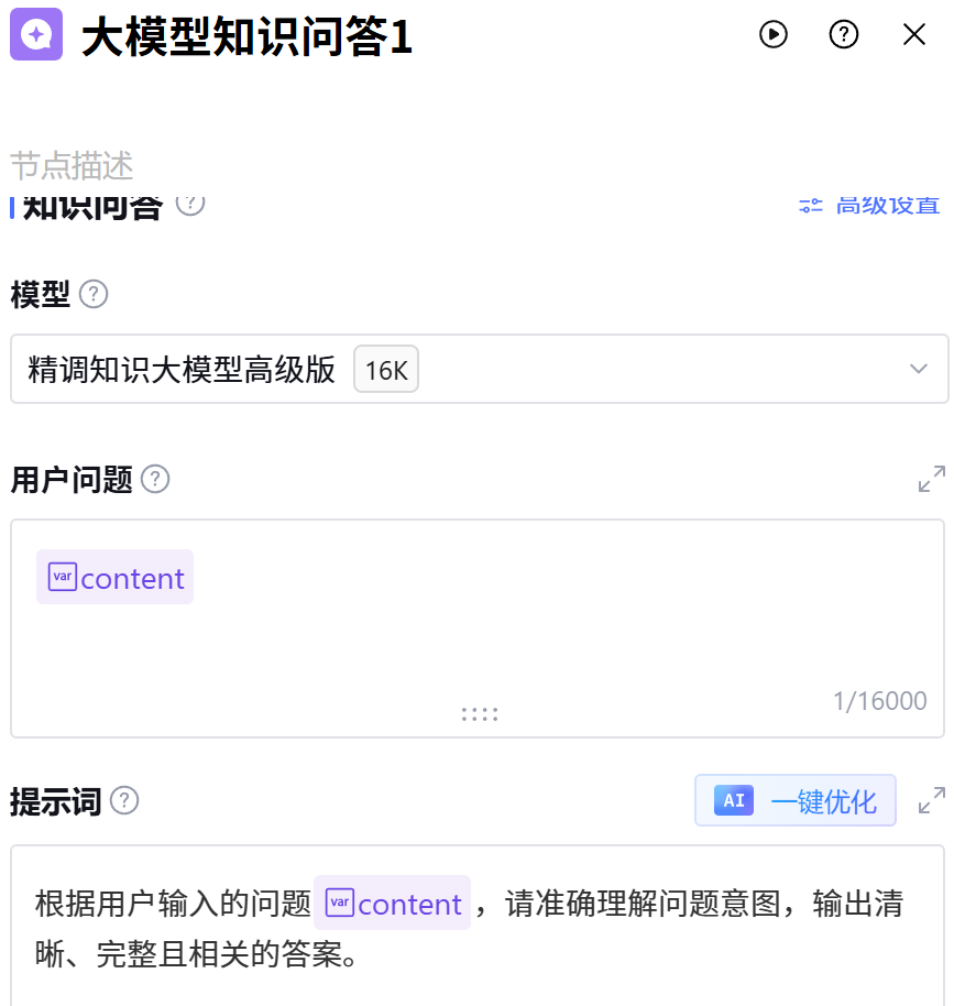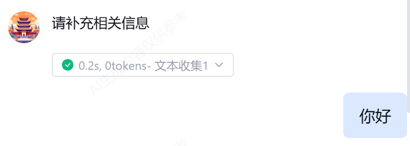 :在问答场景中向用户提问,并原样输出用户回答。适用场景:收集信息后传递给后续节点处理、沉淀意见反馈原文、合规留存等;特点:不做判断、不追问,一次性收集(如需从用户消息中收集参数,或发起多轮对话引导用户提供,请使用"参数提取节点")。