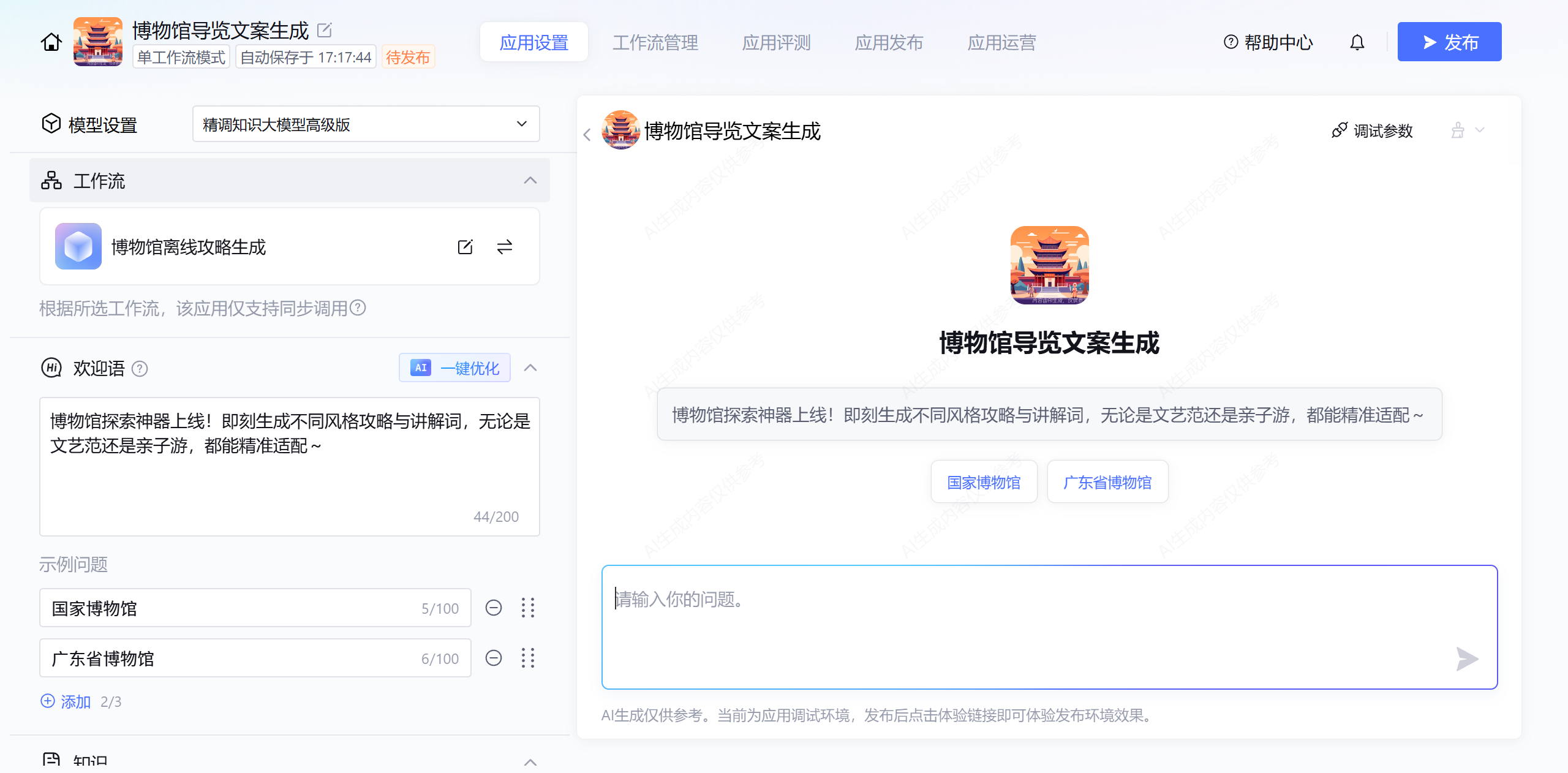 点击刚才选择的智能体,进入到该智能体里面的编辑页面,在这个应用设置页面左边的模型设置、工作流、欢迎语等这些都可以自定义: