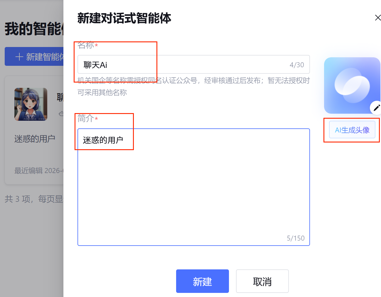 (2)填写智能体的名称和简介,可以点击AI生成头像来显示头像: