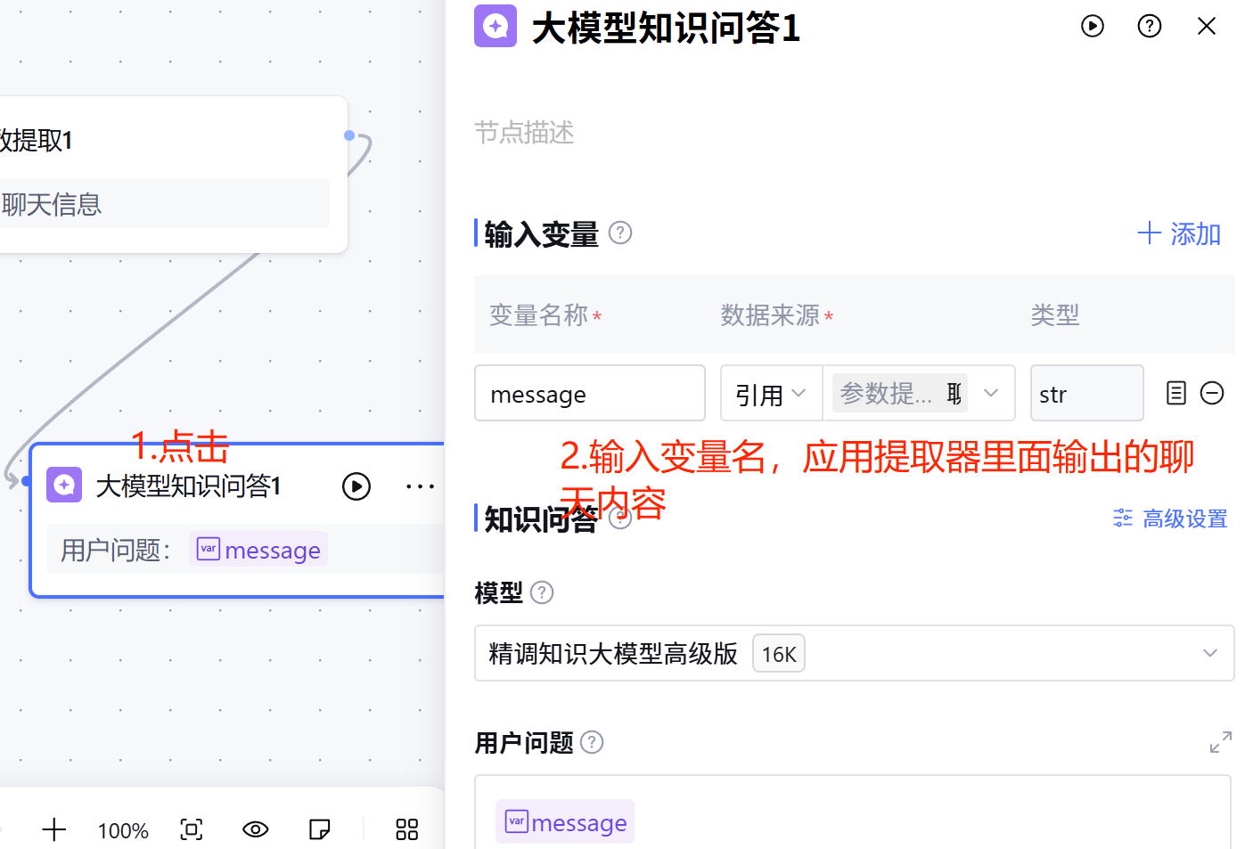 (7)第二步,选择大模型知识问答工具,并将其连接到参数提取器后面(工作流必须要有开始和结束)。如下图变量名称要与待会的代码使用的变量名一致(预防出bug),数据源引用参数提取器里面的输出内容来赋值给message,用户问题可以用于进行知识检索,直接写“/”,然后看到输入变量,可以直接回车也可以点击选择该变量: