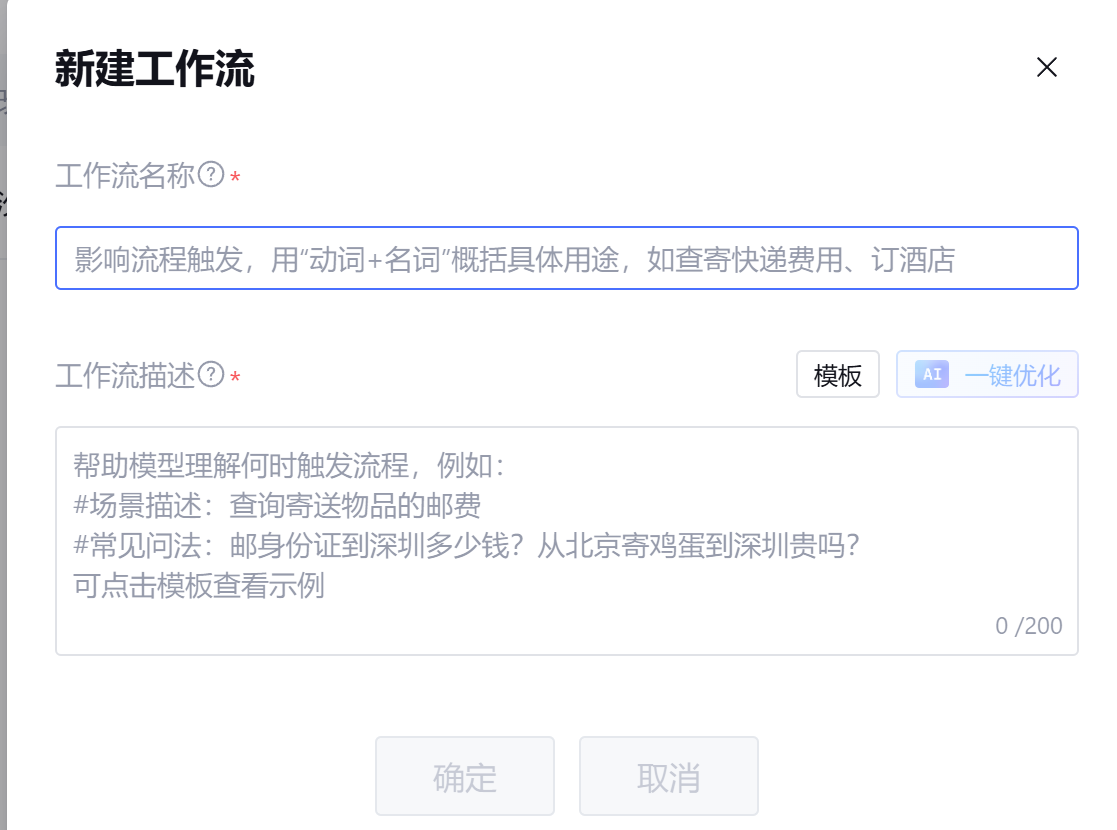 (5)根据个人需求来填写工作流名称(如Ai聊天)和工作流描述(如任务描述: 当用户发起对话交流需求时触发此AI聊天流程,支持各类话题与任意常见问法。 示例问题: "今天天气如何?" "讲个笑话吧" "帮我分析下这篇文章")。可以点击模板并选择一个模板,填入自己的描述(简单明了),点击一键优化,最后点击底部的确认按钮即可进入到工作流编辑页面: