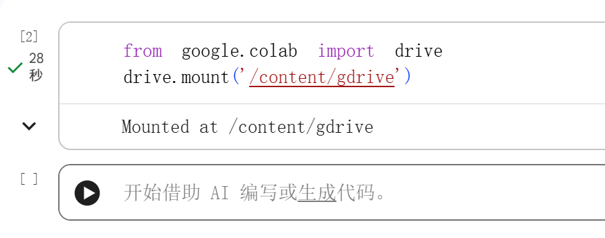 将项目文件上传到Google Drive,colab 登录Google Drive,出现下图表示成功登录,且文件夹目录下出现 gdrive 。
