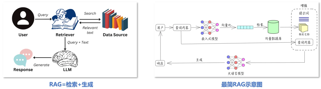 RAG(Retrieval-Augmented Generation,检索增强生成) 是一种结合信息检索与生成模型的技术。其核心思想是:在生成答案前,先从外部知识库(如文档、数据库、互联网)中检索相关证据,再基于检索结果和用户输入生成更准确、可靠的回答。如下图所示为一个最简RAG示意图。