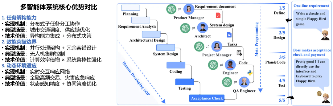 现实世界任务往往过于复杂,单Agent难以胜任,需要多个Agent协作。以漫画图所示,从一个需求到最终交付的产品。首先:计划、需求分析、框架设计、系统方案、编码实现、功能性测试,最后是产品交付。如此复杂的系统需要多人合作,Multi-Agent系统在处理复杂任务方面具有显著优势。
