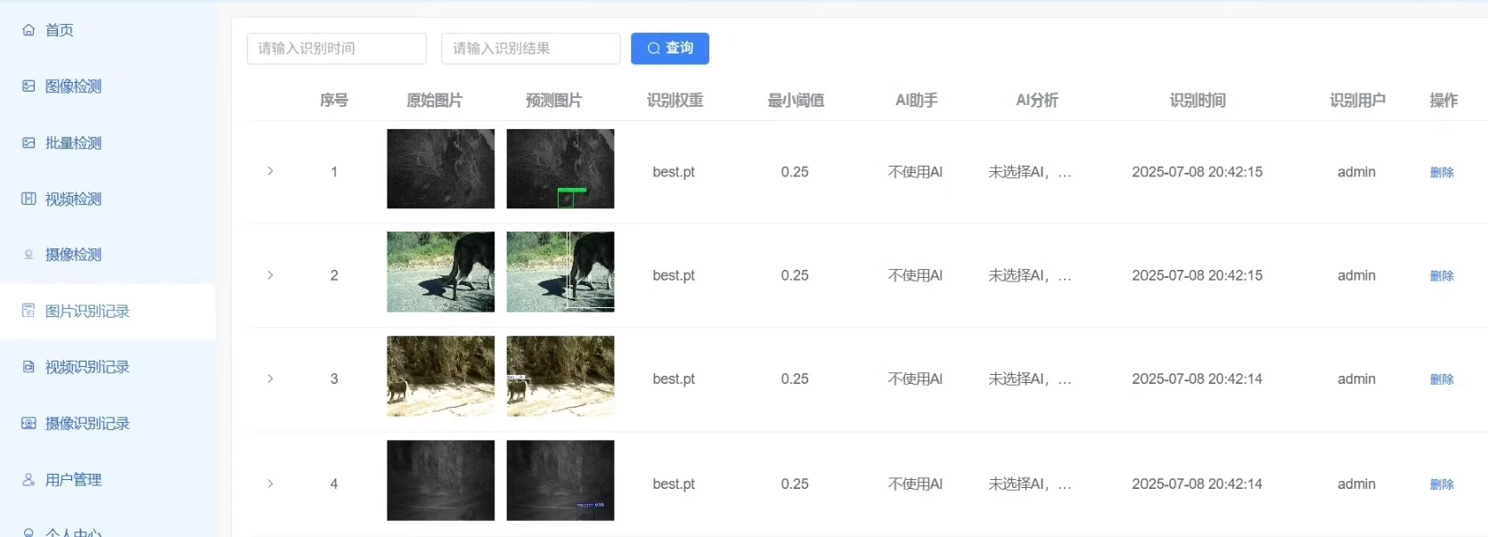 详细结果记录:预测时间、预测图片、操作记录