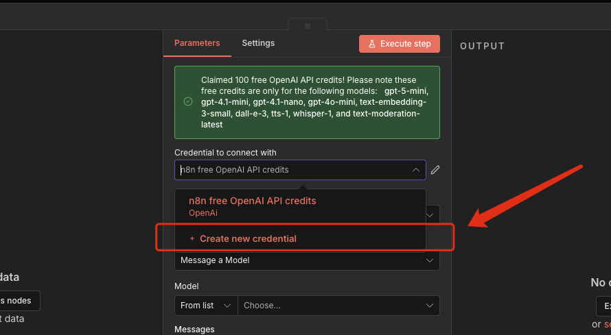 在 OpenAI 节点里找到 Credentials(凭据)相关设置: