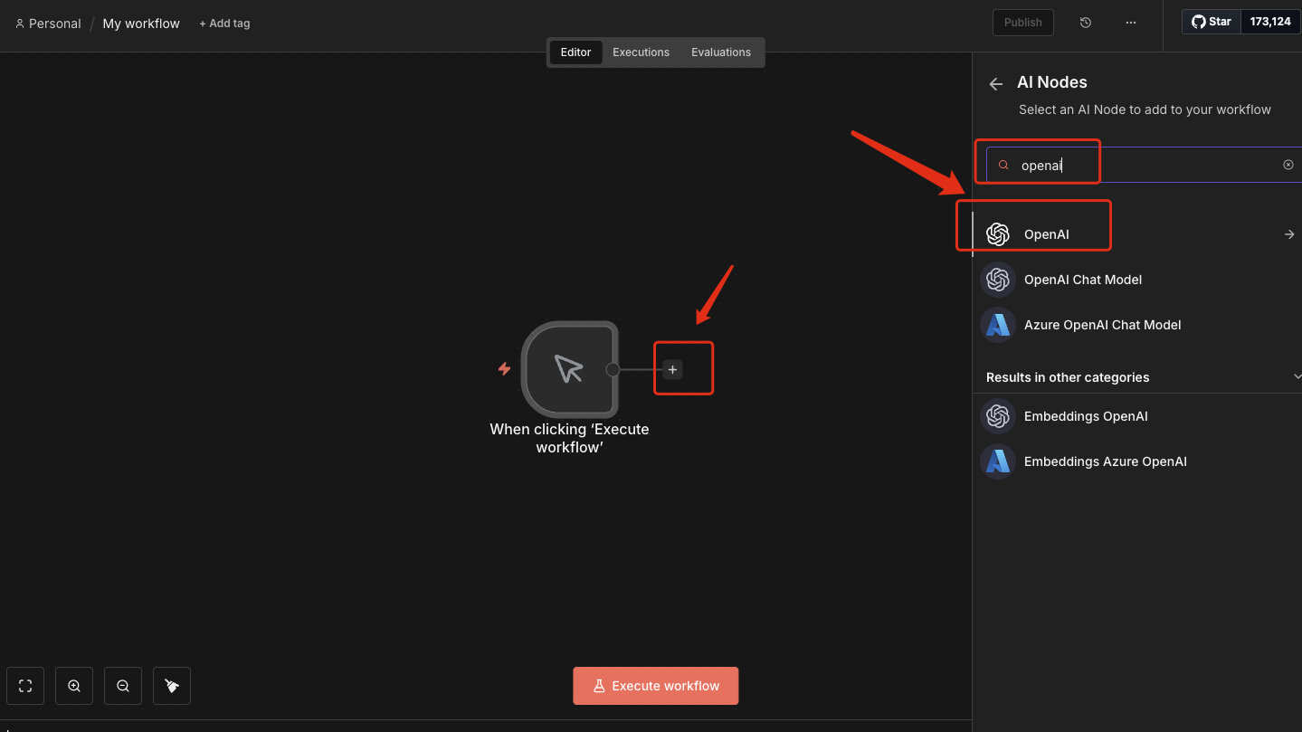 点击 “+” 添加下一个节点,搜索并选择 OpenAI