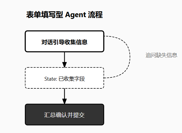 这类 Agent 的目标是引导用户一步步填完一张表单,而不是让用户自己对着表单傻填。核心在于用对话的方式收集结构化信息。