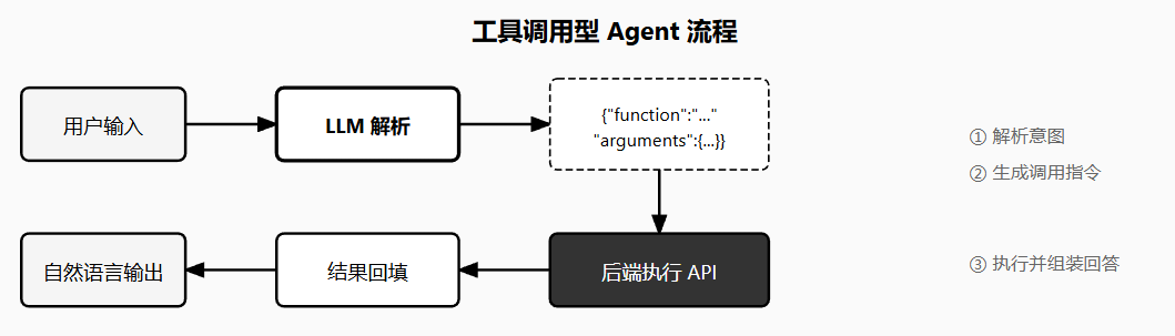 传统的 LLM 只会输出文本。你问它帮我查一下北京明天的天气,它会编造一个答案,因为它没有联网能力。工具调用型 Agent 的作用就是让 LLM 知道,我不会的事情可以调外部接口。模型不再硬编答案,而是返回一段结构化指令,告诉后端系统:去调 get_weather 这个函数,参数是城市北京、日期明天,拿到真实数据后再组装回答。