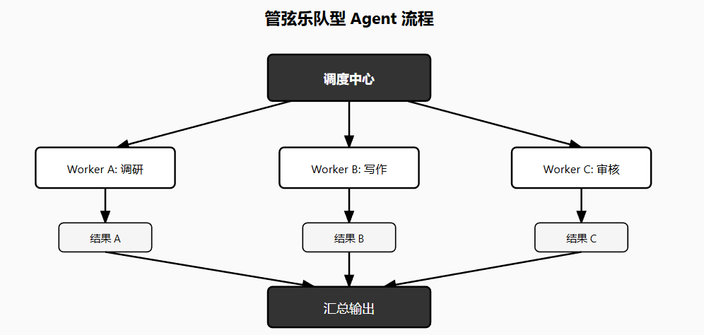 想象一个交响乐团,指挥不演奏任何乐器,但所有乐手都听他的指挥。管弦乐队型 Agent 也是这样,Orchestrator 不执行具体任务,它负责理解用户需求、拆解成子任务、分配给对应的 Worker Agent、收集结果、汇总输出。