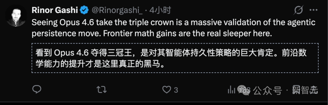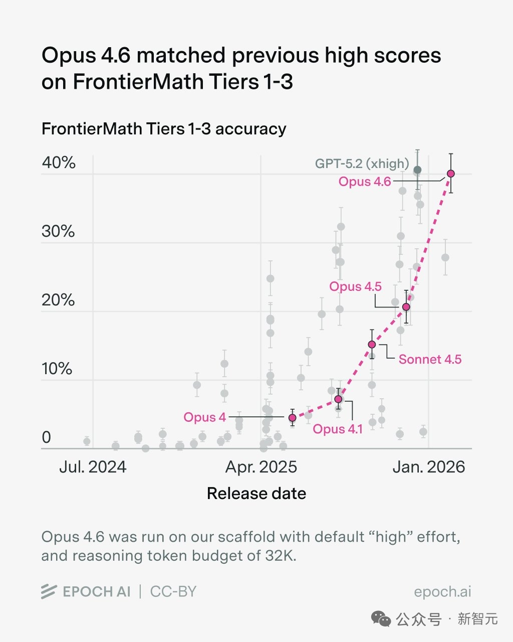 EpochAI的Frontier Math榜单被称为“AI智商检测器”,这里测试的是人类尚未解决的数学难题。Opus 4.6在Tier1-3级别得分40%,在极难的Tier4级别也拿下21%的成绩。