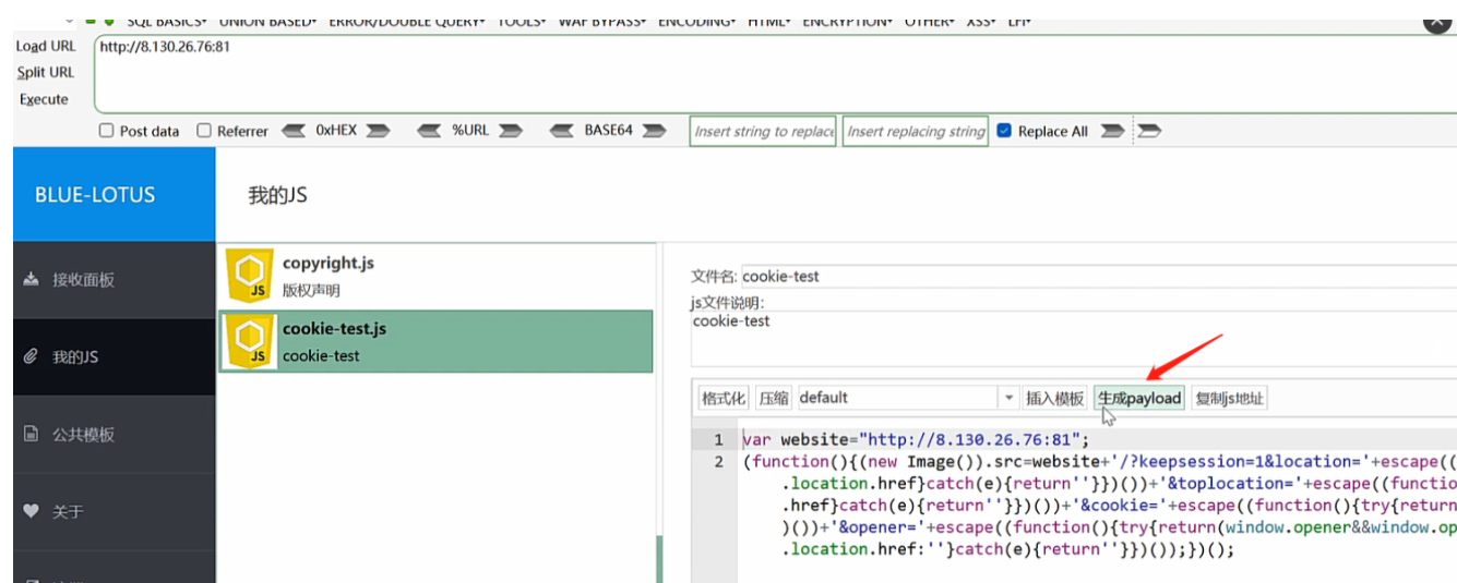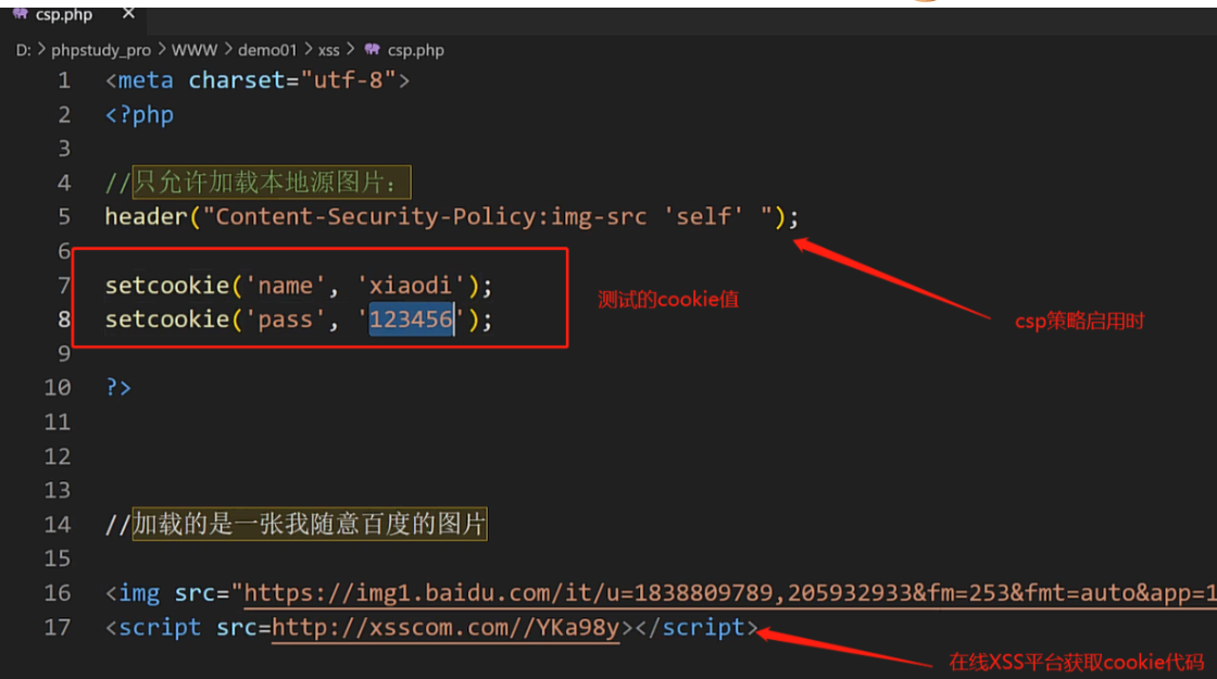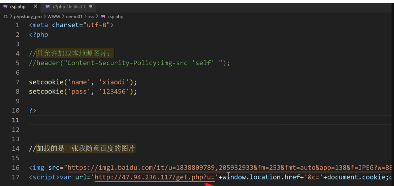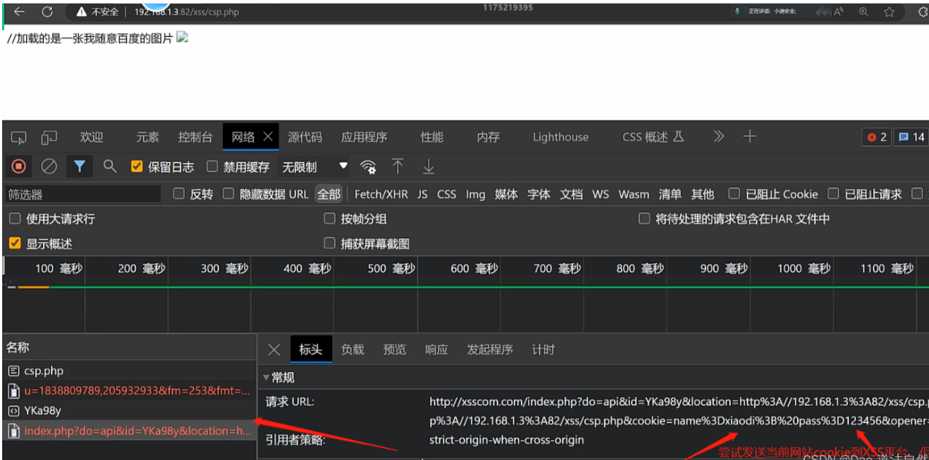 未开启CSP时XSS的加载情况(跟常规一样,直接获取cookie)